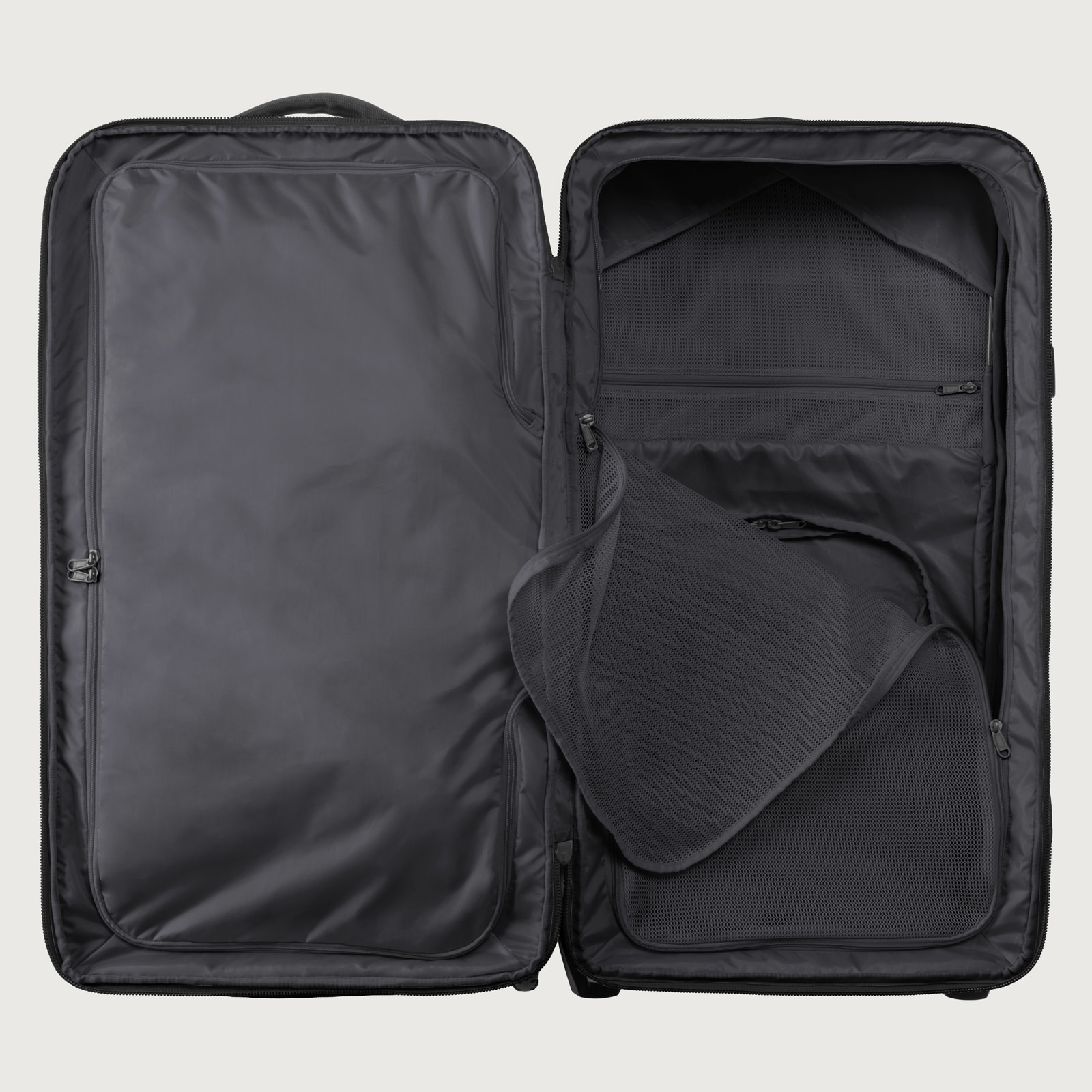 ヘルメットや大型ギアを固定できる収納式カーゴネット