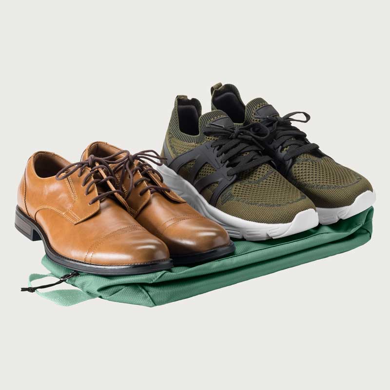 洗濯可能なパックイット リウ゛ィール マルチシューサックで汚れた靴底を密閉し、柔らかい靴革を保護しましょう。構造化された100%リサイクル素材と、2足もしくは3足の靴を整理できる内部の仕切りが特徴で、旅行者の最も必需品とされるシューズをファーストクラスで収納できます。※靴の種類によって、収納数が変わります。