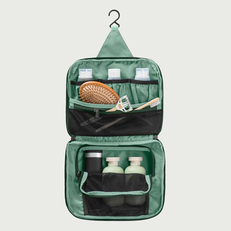 パックイット ハンギング・トイレトリー・キットは、洗面用具を整理し見つけやすく、手に取りやすくします。伸縮性のあるポケットとジッパー付きポケットがボトルをしっかり固定し、2つのコンパートメントが中身を分けて収納します。100%リサイクルの耐水性生地は、水しぶきから保護し、歯磨き粉やローションを早く片付ける事が出来ます。