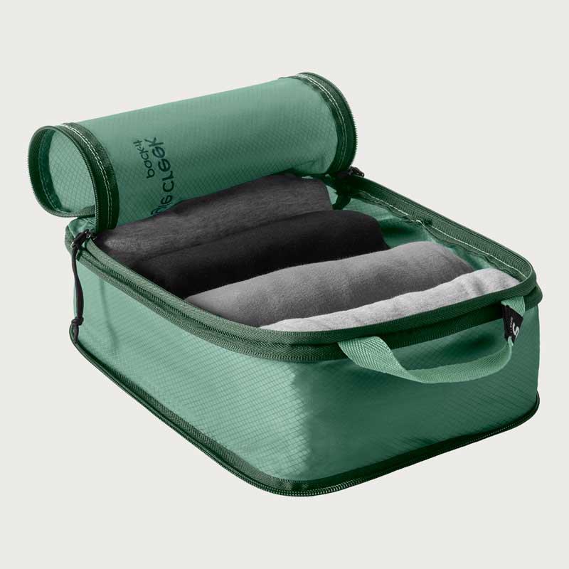 シャツやその他の軽量衣類を最小限に抑えるよう設計されたパックイット アイソレート COMPキューブ Sは、衣類を省スペースなキューブに押し込める丈夫なジッパーが特徴です。キューブ全体には耐水性と軽量性に優れた100%海洋リサイクル素材を使用しています。