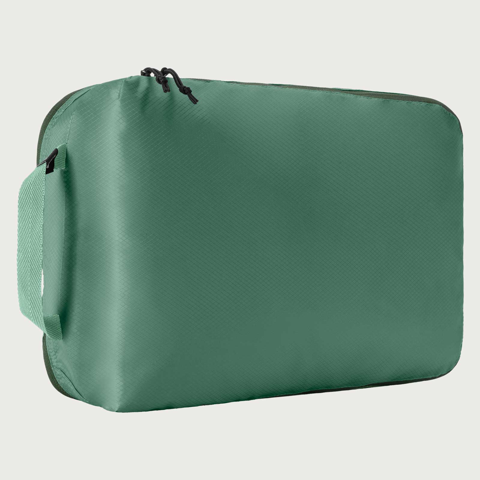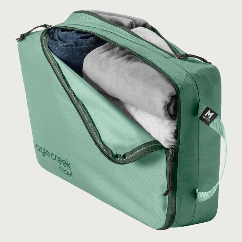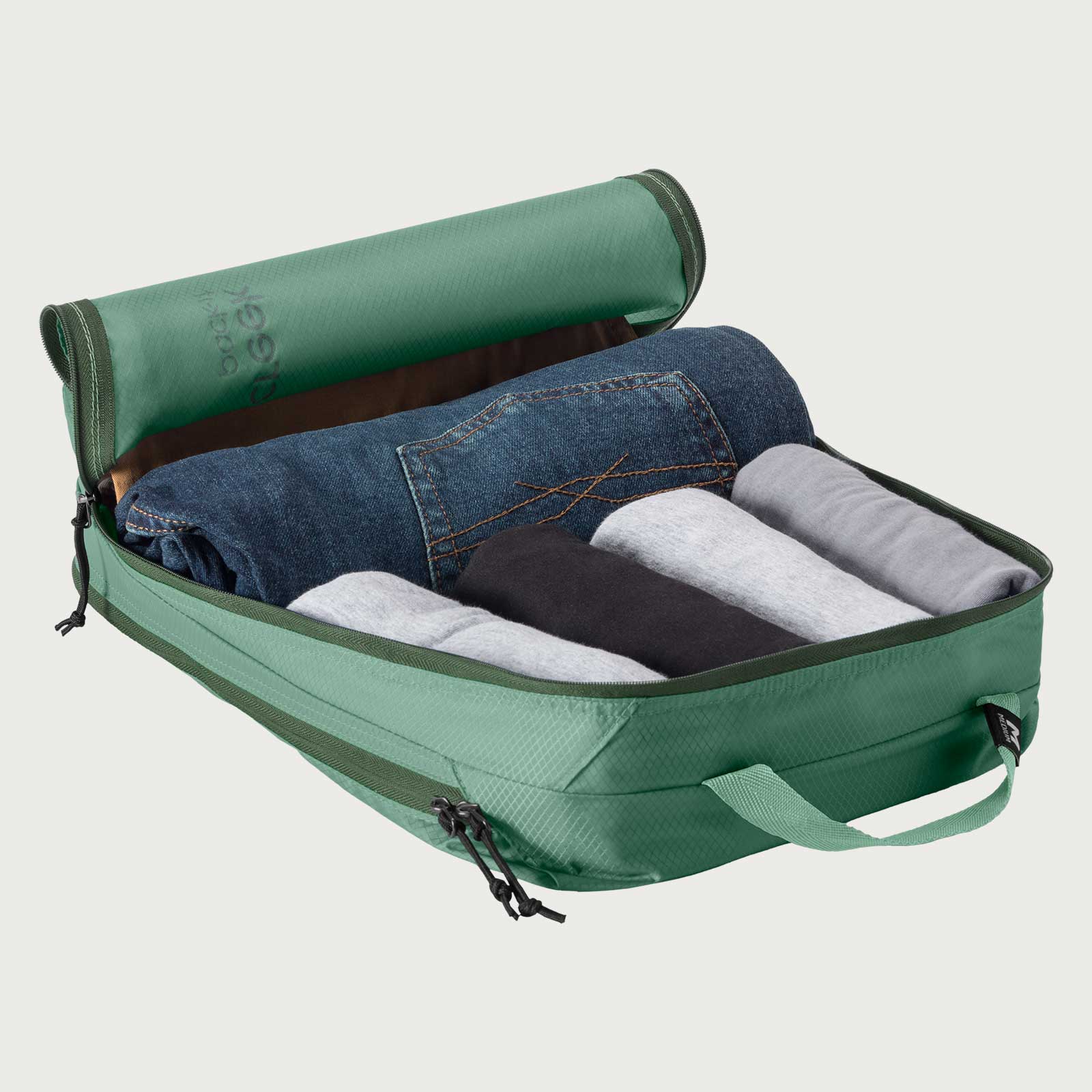 パックイット アイソレート C/Dキューブ Mは、清潔な衣類と汚れた衣類をセンターの仕切りで分けられるオーガナイザーです。開口部に角度がついているため、荷造り中にズボンやシャツ、靴下を所定の位置に固定することができ、軽量で100%海洋リサイクル素材の生地は耐水性があり、洗濯も可能です。